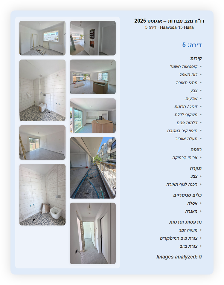 הדוחות מדגישים ומפרטים את מצב העבודה והמרכיבים החיוניים, ומספקים תמונה ברורה של ההתקדמות בכל דירה, קומה או חזית